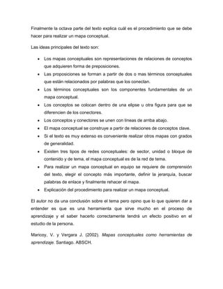 El documento habla sobre los mapas conceptuales, explicando que son representaciones gráficas de relaciones entre conceptos a través de proposiciones. Describe los componentes clave de los mapas conceptuales como proposiciones, términos conceptuales y conectores. Además, explica cómo organizar los conceptos, los diferentes tipos de redes conceptuales, y el procedimiento para crear mapas conceptuales de manera individual o en equipo como una herramienta para el aprendizaje.