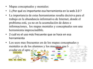Los mapas conceptuales y mentales son herramientas importantes en la web 2.0 para organizar la gran cantidad de información disponible. Son útiles para el aprendizaje ya que los estudiantes y maestros los usan para ayudar en la comprensión de temas. Joseph Novak creó los mapas conceptuales y Tony Buzán los mapas mentales. Estas herramientas ofrecen beneficios como mejorar la creatividad y la retención de información.