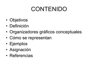 Este documento describe los mapas de conceptos, que son organizadores gráficos para representar las relaciones entre conceptos. Explica que los mapas de conceptos fueron creados por Joseph Novak para apoyar el aprendizaje significativo, y consisten en conceptos unidos por palabras enlaces para formar proposiciones. Proporciona ejemplos de cómo se representan los mapas de conceptos y sus beneficios para organizar y comprender información.