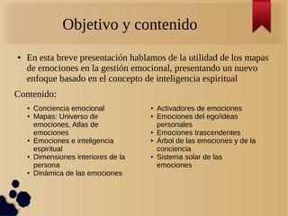 El documento explora la utilidad de los mapas de emociones en la gestión emocional, destacando su relación con la inteligencia espiritual y la conciencia emocional. Se presentan diferentes enfoques sobre las dimensiones del ser humano y cómo las emociones se generan en el contexto del ego y la trascendencia. Además, se analiza la clasificación de los activadores emocionales y la dinámica entre las emociones egoicas y trascendentes.
