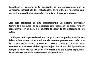 El documento describe el desarrollo de un sistema curricular en el país para asegurar los aprendizajes requeridos por los estudiantes. Los Mapas de Progreso describen claramente los aprendizajes que los estudiantes deben lograr en cada ciclo de la educación básica, y las Rutas de Aprendizaje orientan las estrategias de enseñanza de los docentes para favorecer el aprendizaje de los estudiantes.