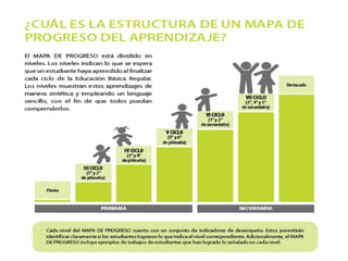 El documento describe el desarrollo de un sistema curricular en el país para asegurar los aprendizajes requeridos por los estudiantes. Los Mapas de Progreso describen claramente los aprendizajes que los estudiantes deben lograr en cada ciclo de la educación básica, y las Rutas de Aprendizaje orientan las estrategias de enseñanza de los docentes para favorecer el aprendizaje de los estudiantes.