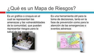 El documento describe un taller sobre la construcción de mapas de riesgo comunitario en Arauca, Colombia, dirigido por Rodrigo Restrepo González. Los mapas de riesgo son herramientas gráficas que permiten identificar amenazas y vulnerabilidades en la comunidad, facilitando la toma de decisiones en la gestión del riesgo y la planificación de emergencias. Se resalta la importancia de la participación comunitaria en la elaboración de estos mapas, así como los pasos a seguir para su creación y validación.