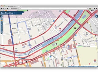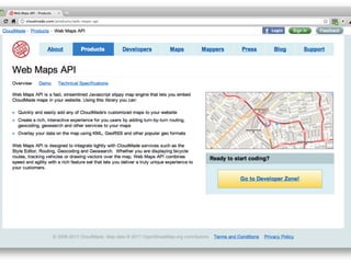 Este documento presenta cómo usar los mapas de Cloudmade en aplicaciones web para mostrar rutas entre dos puntos marcados en el mapa. Explica brevemente los pasos necesarios para inicializar la API de Cloudmade, dibujar los marcadores de inicio y destino, y trazar la ruta entre ellos. También agradece a varias organizaciones y personas por su apoyo.