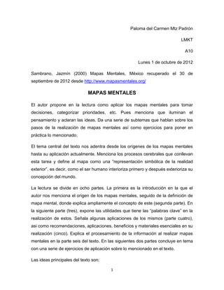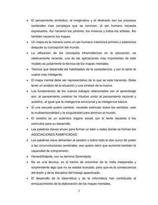 Los mapas mentales permiten organizar y clarificar ideas. El documento explica que los mapas mentales nacieron como una forma de representar el mundo exterior y procesar la información de manera simbólica y creativa. También describe los pasos para crear mapas mentales efectivos utilizando palabras clave y asociaciones ramificadas, y cómo esta técnica puede mejorar la inteligencia y el aprendizaje.
