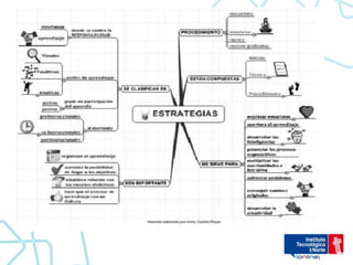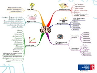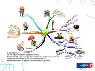El documento proporciona instrucciones para crear mapas mentales. Explica que los estudiantes elaborarán mapas mentales al final de la sesión teniendo en cuenta las características y condiciones respectivas. Define un mapa mental como una técnica gráfica para organizar y representar información de manera resumida y didáctica. Luego, detalla los pasos para elaborar un mapa mental, que incluyen ubicar el tema central, dividirlo en líneas de diferentes colores y tamaños de letra, y analizar ejemplos.