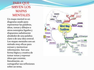 Los mapas mentales son diagramas que representan palabras, ideas y conceptos relacionados radialmente con una idea central. Se pueden utilizar para generar, visualizar, estructurar y clasificar ideas, así como para organizar y estudiar información, resolver problemas, tomar decisiones y escribir. Los mapas mentales tienen aplicaciones en diferentes ámbitos como la toma de notas, el desarrollo de ideas y la memoria.