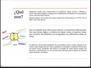 Un mapa mental es un diagrama que representa palabras, ideas y conceptos relacionados alrededor de una palabra clave central. Sirve para organizar y representar información de manera creativa y espontánea para facilitar su memorización. Se elabora colocando una imagen central y derivando ideas relacionadas de forma ramificada, usando palabras, imágenes y conectores. Existen programas como Edraw Mind Map, CmapTools y XMind que ayudan a crear mapas mentales de manera gratuita.