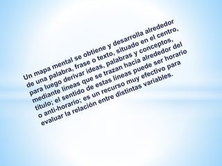 El documento habla sobre los mapas mentales. Explica que los mapas mentales son diagramas utilizados para representar palabras, ideas y conceptos relacionados con una idea central de manera radial. Ofrecen una forma lógica y creativa de organizar la información y tomar notas de manera que la información pueda ser asimilada y recordada fácilmente. Los mapas mentales ayudan a generar, visualizar y clasificar ideas para organizar la información, resolver problemas y tomar decisiones de manera efectiva.