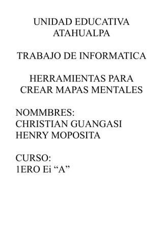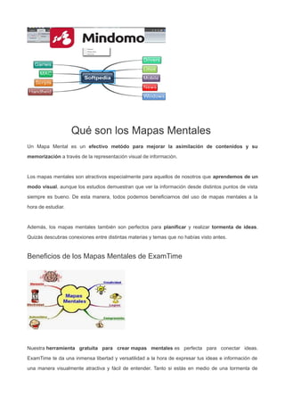 Este documento describe los beneficios de usar mapas mentales para estudiar. ExamTime es una herramienta gratuita que permite crear mapas mentales online de manera fácil y versátil para conectar ideas y mejorar la comprensión y memorización de la información de manera visual. Los mapas mentales ayudan a estudiantes a planificar, realizar tormentas de ideas y descubrir nuevas conexiones entre temas.