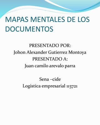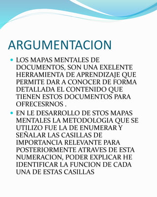 El documento presenta un resumen de los mapas mentales de documentos como una herramienta de aprendizaje para dar a conocer de forma detallada el contenido de diferentes documentos. Explica que la metodología utilizada consiste en enumerar y señalar las casillas de importancia para posteriormente explicar la función de cada una. Finalmente, menciona que la mayoría de formatos utilizados corresponden a documentos necesarios para una empresa de transporte.