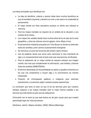 El documento habla sobre los mapas mentales, explicando que existen diferentes tipos de mapas y que los mapas mentales tienen beneficios educativos como mejorar la memoria. Luego describe los pasos para crear un mapa mental efectivo, incluyendo tener una imagen central y asociar ideas de manera ramificada usando palabras clave. El autor concluye que aprender a hacer mapas mentales bien puede ayudar a las personas en su vida.
