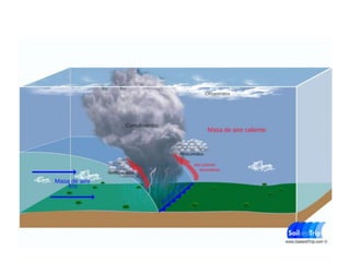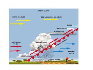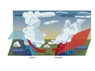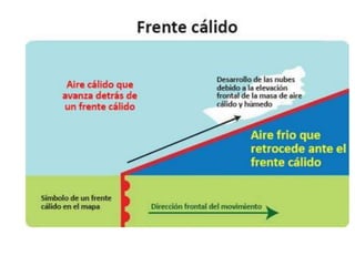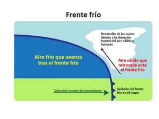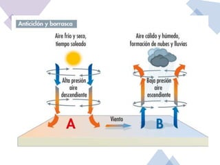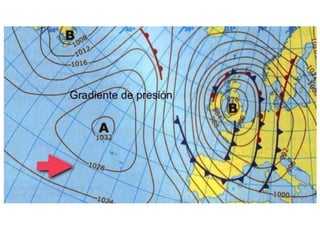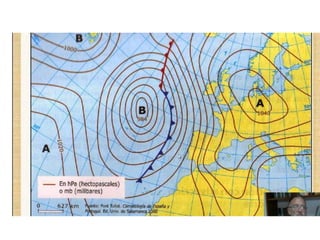 Este documento describe los elementos clave de los mapas meteorológicos de isobaras. Explica que las isobaras conectan puntos de igual presión atmosférica y que los mapas representan los valores de presión que afectan el clima de una región. Describe los frentes cálidos y fríos, las borrascas y anticiclones, e indica que las borrascas suelen traer precipitaciones mientras que los anticiclones generalmente no.