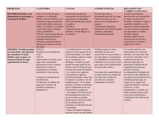 Este documento describe varios problemas ambientales relacionados con el cambio climático, incluyendo la deforestación, la erosión del suelo, el agujero de la capa de ozono y la extinción de especies. Explica las causas de estos problemas como la tala excesiva de árboles, malas prácticas agrícolas y el uso de ciertos químicos, y sus consecuencias como alteraciones climáticas, aumento del nivel del mar, y pérdida de biodiversidad. También destaca la relación entre estas amenazas ambient