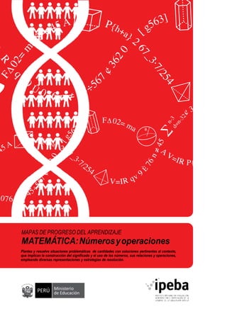 Este documento presenta el Mapa de Progreso de Números y Operaciones para la asignatura de Matemática. Describe los diferentes niveles de aprendizaje esperados para cada ciclo de educación básica regular, así como ejemplos de indicadores de desempeño y trabajos de estudiantes para cada nivel. El objetivo es garantizar que todos los estudiantes peruanos alcancen los aprendizajes fundamentales en Matemática requeridos para la vida cotidiana.