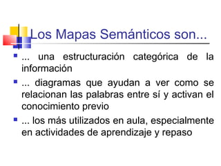 Los mapas semánticos son una estructuración categórica de la información que ayuda a ver las relaciones entre palabras y conceptos a través de diagramas. Estos mapas activan el conocimiento previo y son útiles para organizar y comprender información nueva. Consisten en un término central con palabras asociadas y conexiones entre ellas.