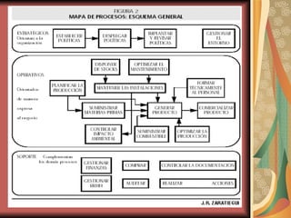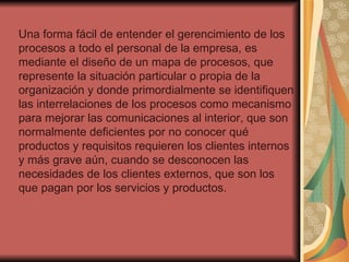El mapeo de procesos permite identificar las interrelaciones entre los procesos de una organización para mejorar la comunicación interna. Muestra las etapas, actividades e interacciones de cada proceso, así como los clientes internos y externos. Los beneficios incluyen una visión global del proceso, identificar áreas de mejora y estandarizar los procedimientos. Los pasos para el mapeo son identificar clientes, insumos, resultados, etapas y establecer objetivos e indicadores para cada proceso.