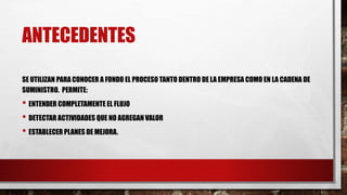 El documento describe la importancia de los mapas de valor en el análisis y mejora de procesos dentro de una empresa y su cadena de suministro. Estos mapas permiten visualizar y documentar el flujo de producción e información, identificar áreas de mejora y planificar acciones para optimizar el proceso. Se detallan los tipos de mapas, su creación y simbología, así como métricas clave como tiempos de ciclo y takt time.