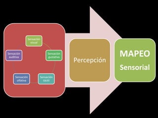 El documento habla sobre el mapeo sensorial. Explica que el mapeo sensorial implica observar y analizar cómo las personas perciben y experimentan los espacios a través de sus sentidos. El mapeo sensorial provee información valiosa para crear entornos que sean más inclusivos y accesibles para todos.