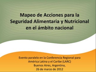 Este documento presenta el Mapeo de Acciones para la Seguridad Alimentaria y Nutricional (MAFSAN) como un mecanismo para fortalecer la capacidad de los gobiernos nacionales y sus socios de desarrollo para la toma de decisiones fundamentadas y la coordinación de actores y acciones en materia de seguridad alimentaria y nutricional. Propone una plataforma web MAFSAN para integrar sistemas de mapeo existentes y expandirse a nuevos países, siguiendo principios de apropiación nacional, alianzas y ar