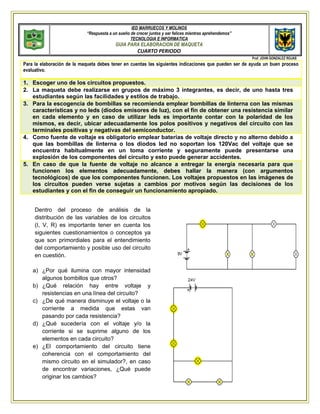 Este documento proporciona instrucciones para la elaboración de una maqueta de un circuito eléctrico como parte de un proyecto escolar. Indica que los estudiantes deben escoger uno de los circuitos propuestos y construir la maqueta en grupos de hasta 3 personas. Además, ofrece recomendaciones sobre el uso de bombillas y baterías, y enfatiza la importancia de considerar conceptos como la intensidad de la luz, la relación entre voltaje y resistencia, y cómo estos cambian a lo largo del circuito.