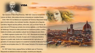 El documento presenta un resumen de la vida y obra del filósofo y político italiano Nicolás Maquiavelo. Vivió en el siglo XV en Florencia durante el Renacimiento, época en la que Italia estaba dividida en ciudades-estados. Ocupó cargos políticos pero cayó en desgracia cuando los Médici recuperaron el poder. Sus principales obras fueron El Príncipe y Discursos sobre la Primera Década de Tito Livio, donde analiza formas de gobierno y ofrece consejos para gobernantes seculares basados en