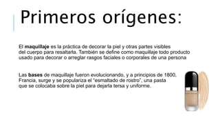 El maquillaje se define como la práctica de decorar la piel y otras partes visibles del cuerpo para resaltarlas o mejorar rasgos faciales. En el 1800 en Francia surgió el "esmaltado de rostro", una pasta que dejaba la piel tersa y uniforme. Ingredientes como escamas de pescado y escarabajos aplastados se han usado en maquillajes, y antes del blush las mujeres se pellizcaban las mejillas. Algunos de los maquillajes más caros cuestan hasta 2000 d