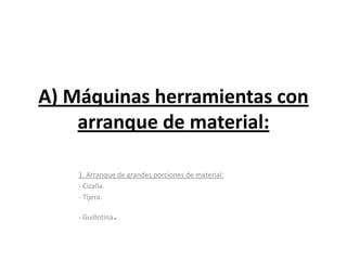 Este documento describe los requisitos básicos de las máquinas herramientas y describe varios tipos de máquinas como tornos, fresadoras y taladros. Explica sus partes principales y los tipos de trabajos que pueden realizar cada una.