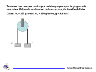 Dos cuerpos de masas 250g y 200g están unidos por un hilo que pasa por una polea. El documento explica cómo calcular la aceleración de los cuerpos (1.09 m/s2) y la tensión en el hilo (2.18 N) aplicando la segunda ley de Newton al sistema formado por los dos cuerpos y el hilo, y considerando las fuerzas que actúan sobre cada cuerpo de manera individual.
