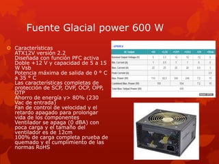 Este documento lista las especificaciones y precios de los componentes para una maquina de escritorio, incluyendo una fuente de alimentación de 600W, un procesador Intel Core i7-2600k, una placa base Intel DP67BG, 8GB de memoria RAM DDR3, un disco SSD de 80GB, un disco duro de 2TB, una tarjeta de video Gigabyte GeForce GTS 450 de 1GB, un lector/grabador de Blu-Ray LG, un teclado y mouse Logitech MK250, una caja ATX y Windows 7 Home Premium.