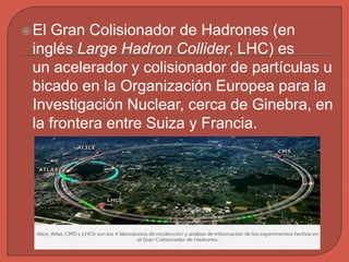 El Gran Colisionador de Hadrones (LHC) es un acelerador y colisionador de partículas ubicado cerca de Ginebra que fue diseñado para colisionar haces de protones a energías de hasta 7 TeV con el propósito de examinar la validez del Modelo Estándar de física de partículas y descubrir nuevas partículas como el bosón de Higgs. El LHC es el experimento que ha involucrado al mayor número de científicos de todo el mundo y tiene como objetivo proporcionar datos para desarrollar una teor
