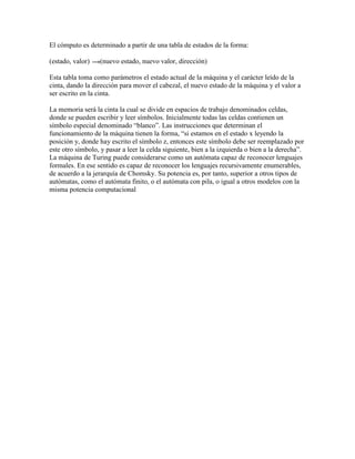 La máquina de Turing es un modelo computacional teórico que consiste en un cabezal lector/escritor y una cinta infinita dividida en celdas. El cabezal lee los símbolos de la cinta, los borra y escribe nuevos símbolos según una tabla de estados y transiciones. La máquina se mueve celda por celda a lo largo de la cinta y puede reconocer lenguajes formales de manera recursiva. Es más poderosa que autómatas finitos o con pila y tiene la misma potencia computacional que otros