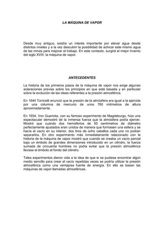 La máquina de vapor fue un invento fundamental del siglo XVIII que tuvo un papel clave en la Revolución Industrial. Se desarrolló a partir de intentos previos de utilizar la presión atmosférica y del vapor de agua para generar energía mecánica, destacándose las máquinas de Thomas Savery, Denis Papin y Thomas Newcomen. No obstante, la máquina de James Watt de 1765, al introducir el condensador separado, logró un mayor ahorro de energía y potencia, convirtiéndose en el motor más importante