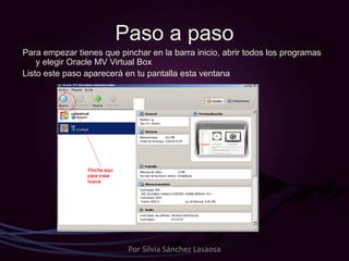El documento describe los pasos para crear una máquina virtual usando Oracle VM VirtualBox. Explica cómo iniciar el programa VirtualBox, crear una nueva máquina virtual asignándole un nombre, sistema operativo, memoria RAM y un disco virtual. Luego guía al usuario a través de la configuración de la máquina virtual recién creada e instalación de Ubuntu, incluyendo la selección de idioma, teclado, nombre de usuario y contraseña.