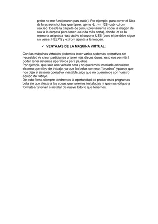 Una máquina virtual es un software que emula una computadora completa, permitiendo ejecutar programas como si se estuviera usando un hardware físico real. Esto permite ejecutar múltiples sistemas operativos de forma aislada en una sola computadora física sin particionar el disco duro. Las máquinas virtuales limitan los recursos que los procesos pueden usar para evitar afectar al sistema anfitrión.
