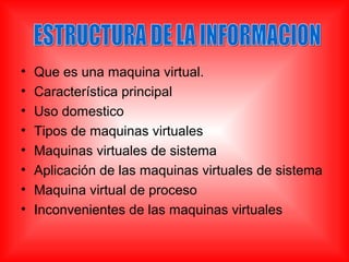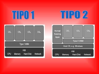 Este documento describe diferentes tipos de máquinas virtuales, incluyendo máquinas virtuales de sistema que permiten ejecutar múltiples sistemas operativos en un solo hardware físico, y máquinas virtuales de proceso que ejecutan aplicaciones de forma aislada. También discute técnicas de virtualización como emulación de hardware y virtualización a nivel de sistema operativo, e incluye listas de hardware y software compatible con virtualización.