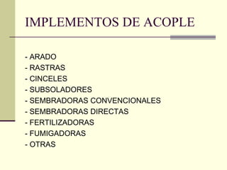 Este documento presenta una introducción a las maquinarias agrícolas, incluyendo implementos de acople como arados, rastras y sembradoras. Describe diferentes tipos de labranzas y arados, como de rejas, discos y cinceles. También cubre implementos para labranzas secundarias, cultivadores, rastras y rodillos. Finalmente, explica brevemente sembradoras convencionales y de siembra directa, así como fertilizadoras y pulverizadoras.