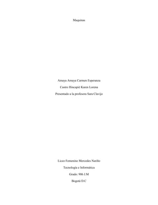 Este documento presenta un informe sobre maquinas. Explica diferentes tipos de maquinas como maquinas rotatorias, sincrónicas, asincrónicas y conmutadas. También describe generadores, motores, compresores y maquinas estáticas como transformadores. El objetivo es explicar el funcionamiento y componentes de estas maquinas para mejorar el conocimiento sobre este tema.