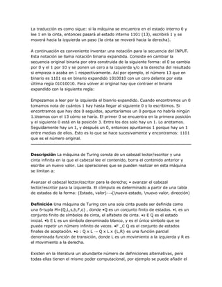 La máquina de Turing es un modelo computacional abstracto introducido por Alan Turing para estudiar la decidibilidad de las matemáticas. Consiste en una cinta infinita con símbolos y un cabezal lector/escritor que se mueve a lo largo de la cinta. Las operaciones se limitan a leer/escribir símbolos y mover el cabezal. El comportamiento se define mediante una tabla de estados que especifica la acción para cada estado y símbolo leído. Este modelo formaliza el concepto de algoritmo y puede simular cualquier computadora real.