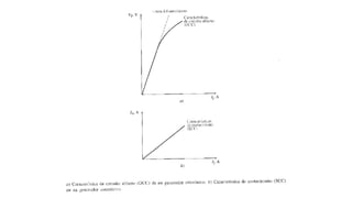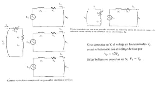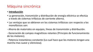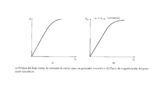 El documento describe los principios básicos de funcionamiento de los generadores síncronos. Explica que un generador síncrono convierte energía mecánica en energía eléctrica trifásica mediante un rotor que actúa como electroimán giratorio. También describe cómo se mide la reactancia síncronica, resistencia del inducido y relación entre flujo y corriente de campo para modelar el comportamiento real de un generador.