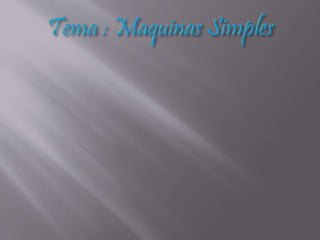 Las máquinas simples como la palanca, la polea, el tornillo y el plano inclinado permiten multiplicar la fuerza aplicada o cambiar su dirección para facilitar diferentes tareas. Algunas máquinas simples comunes son la palanca, que permite levantar o mover objetos aplicando menor fuerza sobre una distancia mayor, y el plano inclinado, que descompone el peso de un objeto para hacer posible su elevación. Las máquinas simples han sido utilizadas desde la antigüedad para ampliar la capacidad física humana y realizar trabajos