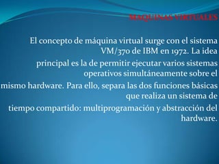 Las máquinas virtuales permiten ejecutar múltiples sistemas operativos de forma simultánea en un solo hardware físico mediante la separación de las funciones de multiprogramación y abstracción del hardware. Existen diversos paquetes de software, tanto comerciales como de código abierto, que permiten crear máquinas virtuales, como VMware, QEMU y Xen. VMware es un sistema de virtualización por software que permite crear máquinas virtuales en las que se puede instalar y ejecutar cualquier sistema operativo de forma aislada.