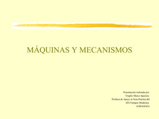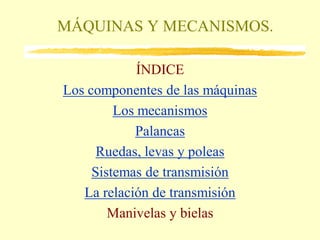 Este documento presenta los componentes básicos de las máquinas y mecanismos. Explica los diferentes tipos de movimientos mecánicos, mecanismos como palancas, ruedas, poleas y engranajes, y cómo se usan los sistemas de transmisión como poleas, cadenas y engranajes para transmitir movimiento entre ejes. También describe cómo la relación de transmisión afecta la velocidad y fuerza, y los usos de manivelas y bielas para convertir entre movimiento rotativo y alternativo.