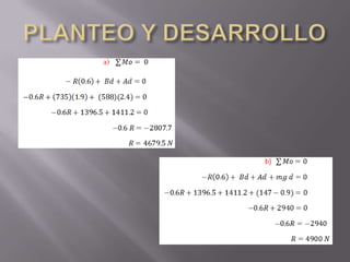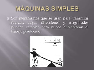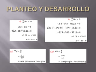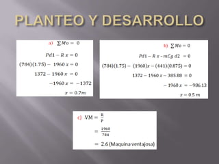 Este documento presenta información sobre palancas, incluyendo definiciones, tipos de palancas, y ejemplos de cálculos mecánicos relacionados a palancas. Explica que una palanca es una barra rígida que gira alrededor de un punto fijo, y define la ventaja mecánica en términos de las distancias entre el punto de apoyo y los puntos donde se aplican las fuerzas. Además, provee ejemplos numéricos para calcular fuerzas, distancias y ventajas mecánicas en