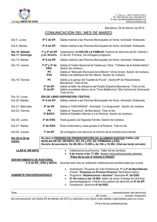 Este documento es una comunicación de las actividades escolares del mes de marzo en el Colegio Amor de Dios en Barcelona. Incluye salidas a piscinas, obras de teatro, museos y otros eventos para diferentes cursos. También anuncia la celebración del Día de la Familia, el periodo de preinscripción y diferentes charlas y talleres.