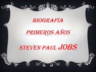 Este documento presenta una breve biografía de Steven Paul Jobs, cofundador de Apple Inc. Nació en 1955 en San Francisco y fue adoptado por una familia de clase media. Mostró interés por la electrónica desde joven y trabajó en Atari e Hewlett-Packard. En 1976 fundó Apple junto a Steve Wozniak y lanzaron el Apple I. En 1984 presentó el Macintosh de interfaz gráfica. Problemas con la dirección llevaron a su salida de Apple en 1985 aunque regresó en 1997 como CEO. Falleció en 2011.