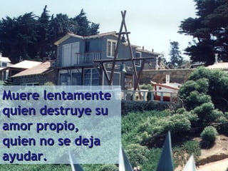 Este poema de Pablo Neruda describe cómo vivir una vida plena evitando morir lentamente. Advierte que aquellos que no viajan ni leen, destruyen su amor propio o no se dejan ayudar, mueren lentamente. Alienta a las personas a no convertirse en esclavas de los hábitos, a enfrentar sus pasiones, y a seguir sus sueños aunque impliquen riesgos en lugar de consejos sensatos. Exhorta a vivir el presente, arriesgarse y permitirse ser feliz.