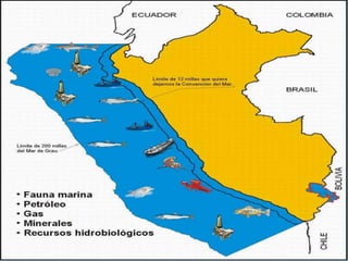 El documento describe el mar peruano, destacando que los principales factores que determinan su riqueza son las corrientes marinas como la Corriente Peruana, la temperatura adecuada, y la concentración de sales y minerales. Explica que la Corriente Peruana trae aguas frías desde la Antártida, manteniendo una temperatura ideal para el desarrollo de la vida marina, mientras que la alta concentración de sales permite que el plancton se mantenga cerca de la superficie.