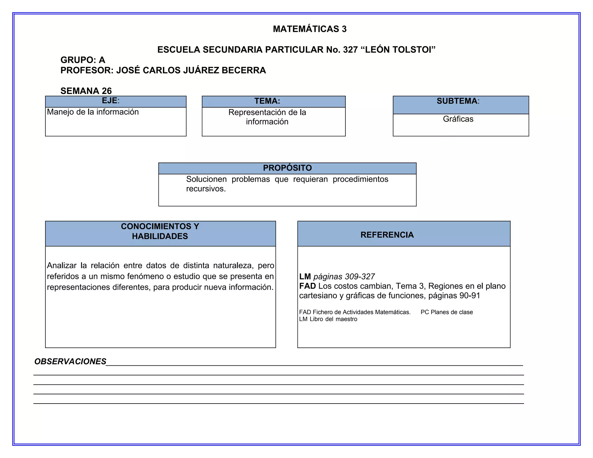 Este documento presenta el plan de clases de Matemáticas 3 para la Semana 26 en la Escuela Secundaria Particular No. 327 “León Tolstoi”. El tema es la representación de la información a través de gráficas. Los estudiantes aprenderán a analizar datos de diferentes fuentes y representarlos gráficamente, así como a localizar e interpretar información en tablas. El profesor José Carlos Juárez Beca planea actividades para que los estudiantes resuelvan problemas que involucren procedimientos recursivos y el cálculo de intereses sobre