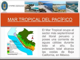 Este documento describe la ecorregión del Mar Tropical del Pacífico en el norte del Perú. Tiene aguas cálidas todo el año y se extiende desde Tumbes hasta Piura. Contiene descripciones detalladas de la flora y fauna como los manglares, playas, arrecifes de coral, y las diferentes comunidades marinas incluyendo peces, aves, y crustáceos. Finalmente, señala que las aguas cálidas de esta región generan grandes nubes que producen lluvias importantes para la costa norte